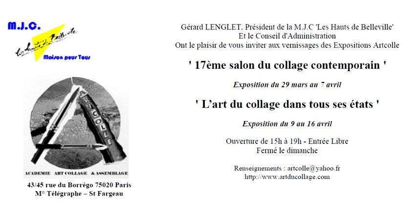 Plusieurs de ces collages seront exposés, assemblés sur un panneau, lors de ces deux expositions parisiennes successives, le 17ème salon du collage contemporain, et l’exposition « l'art du collage dans tous ses états ».